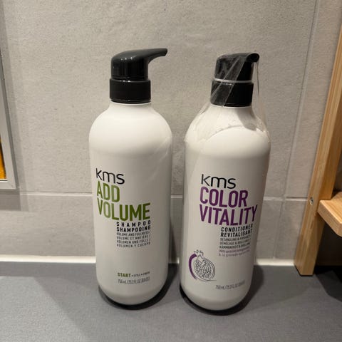 Nesten full shampoflaske (brukt en gang), halvfull balsam og litt under halvfull Slit end savior spray fra Komé.