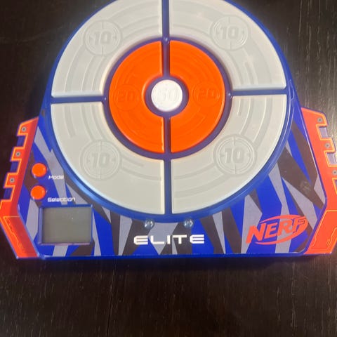 Nerf Elite elektronisk blinkskive i blå og oransje plast. Blinkskiven har flere poengsoner markert i sirkler og et lite display som viser poeng og valg av spillmodus. På siden sitter knapper for å starte og velge modus. Baksiden har utfellbart stativ for plassering på gulv eller bord. Egnet som målskive for Nerf-darts og lignende skumprosjektil-leker.