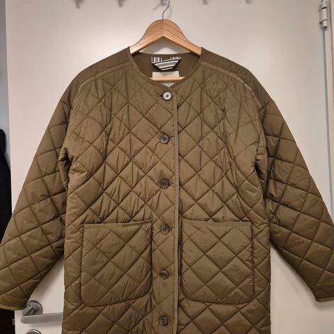 Barbour Gosford quiltet jakke for dame i størrelse 42. Jakken er beige med kontrastdetaljer og stor krage i brun tone. Yttermateriale i polyester med rutete fôr på innsiden. Modellen har trykknapplukking foran, to store utvendige lommer og én innvendig lomme med knapp. Egnet som lett ytterjakke.