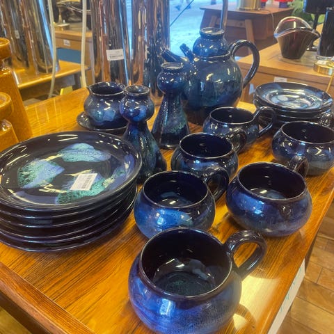 1 stk kaffekanne, 6 stk kopper og 6 stk kopptallerkener. To stk kopper er litt ødelagt på kanten. Se bilder.