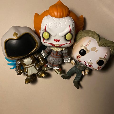 Funko Pop! Blandet utvalg figurer fra ulike serier og univers, inkludert både figurer i originalemballasje og noen uten eske. Egnet som samleobjekter eller utstillingsfigurer på hylle eller skrivebord. Figurenes høyde er standard Funko Pop!-størrelse på ca. 9–10 cm.