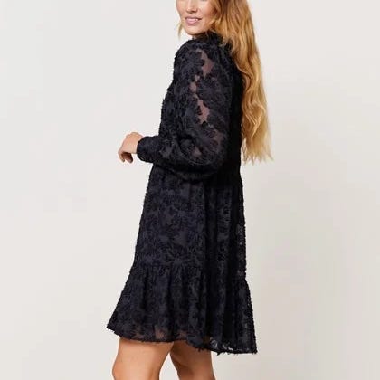 Nelly festkjole i størrelse S for dame. Kjolen er svart. Modellen har lange ermer, v-utringning med volangdetaljer og markert midje med elastisk parti. Skjørtet er kort med lagdelte volanger. Stoffet har en lett, strukturert overflate med diskret mønster. Egner seg til bruk ved fest og andre anledninger der en pen kjole ønskes.
