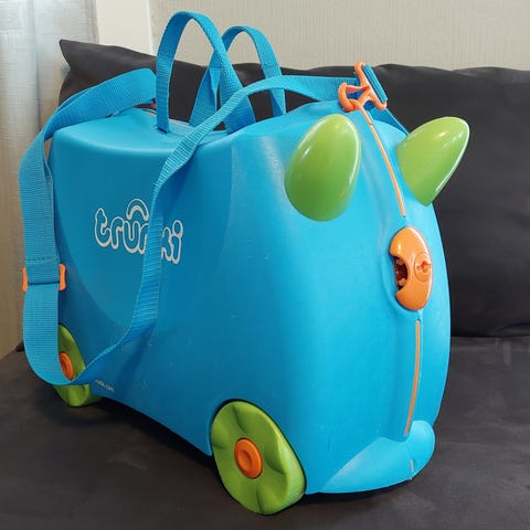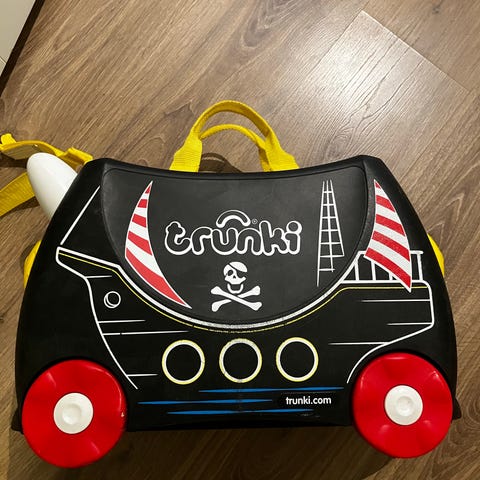 Trunki barnekoffert i plast. Kofferten har hjul og kan trilles eller brukes som sitteleke for barn. Den leveres med bærestropp/skulderreim. Denne kan lgså brukes til å trekke kofferten. Innvendig har kofferten strikkremmer for å holde innholdet på plass samt en liten lomme med strikk. Kofferten lukkes med lås som åpnes med medfølgende plastnøkkel festet i stroppen. Egnet som håndbagasje for barn på reise, overnatting eller oppbevaring av leker.