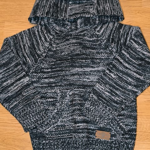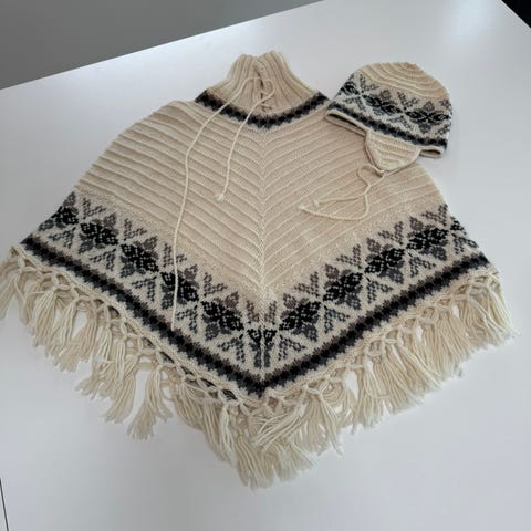Dette er en strikket poncholignende genser med hette og knappedetaljer på sidene.