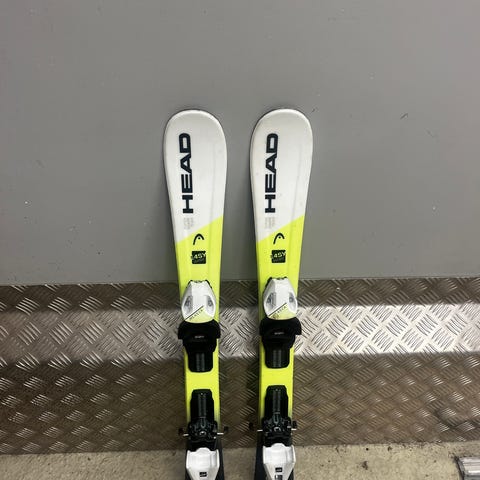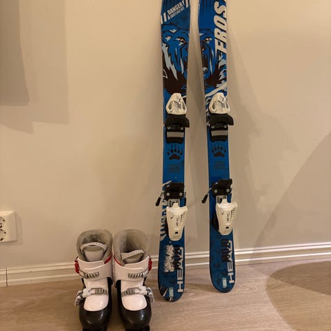 Barnealpinski med tilhørende alpinstøvler (195 mm/ca str 30,5) i blå farge. Skiene har integrerte bindinger og er tilpasset barn. Støvlene har to spenner og justerbar lukking for god passform. Egner seg til bruk i alpinbakke for barn som skal lære eller videreutvikle skikjøring på alpinski.