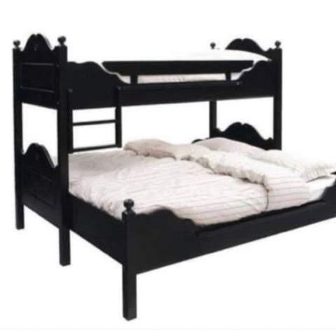 Køyeseng klassisk trehvite. Montert forheng i nedrekøya. Hel og pen uten noe bruksmerker. Sengebunn og madrasser (75cm) følger med.