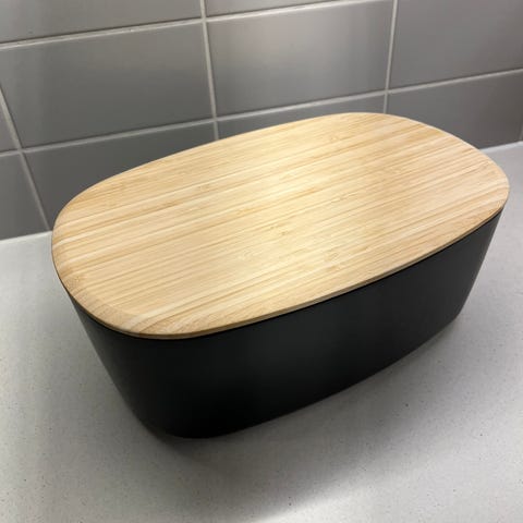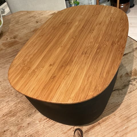 Brødboks med lokk i bambus. Brødboksen har en svart beholder i hard plast og et flatt lokk i bambus som også kan brukes som skjærebrett eller serveringsbrett. Egnet til oppbevaring av brød og bakervarer på kjøkkenbenken. Nøytral, moderne utforming som passer inn på de fleste kjøkken.