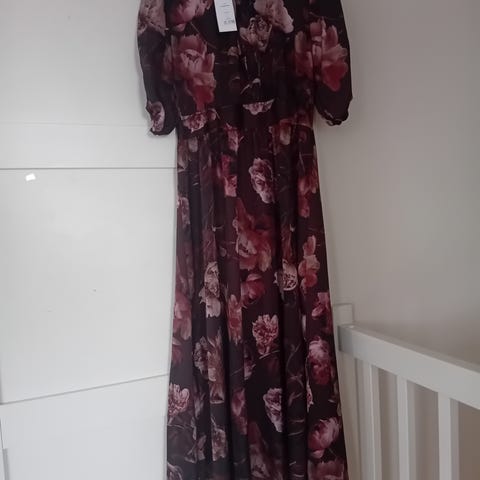 Nydelig mørkblå maxikjole med blomstermønster og V-hals fra Floyd selges. Størrelse large. Den har et mykt og lett stoff. Brukt kun i ett bryllup og fremstår ny. Nypris: 1500 kr.