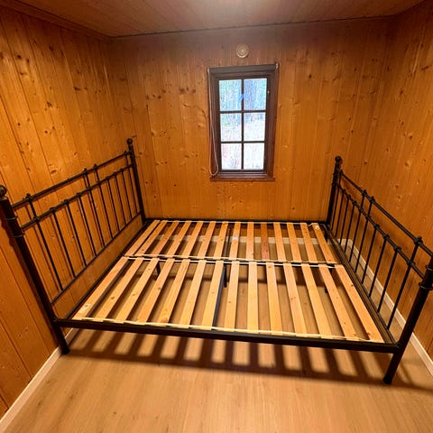 Dagseng i metall. Slitasje på eine stolpen (sjå bilete) elles i god stand. Skummadrass 200x90 kan følge med dersom ønskelig. Må hentes.