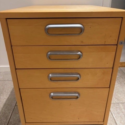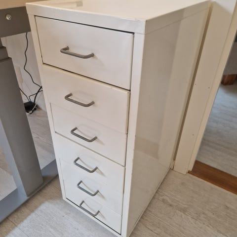 Selger en Ikea kommode med hjul og låsbare skuffer fra serien Effektiv. Kommoden er laget av spon laminat. 2 nøkler følger med. Kommoden har 4 skuffer.