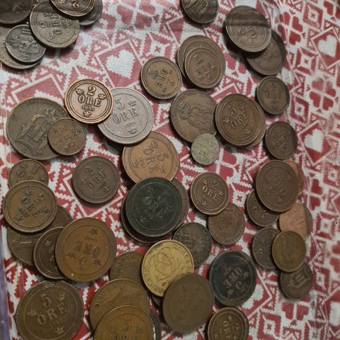Sett med mynter og annet sølv.