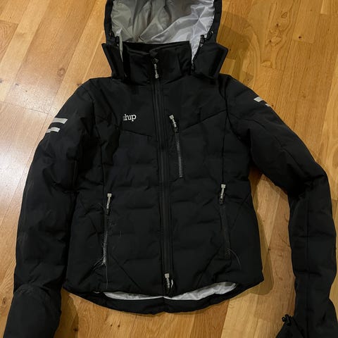 Meget pent brukt jakke selges. Jakken er svart med røtt fôr og har avtakbar hette. Den har glidelås i front, flere glidelåslommer og refleksdetaljer på ermer. Vattert materiale som gir god isolasjon, egnet til bruk i kjøligere vær. Den har også deilig lange ermer som er mulig å forlenge med over hendene