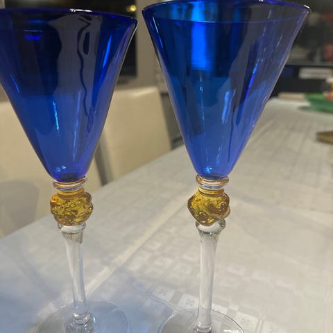 Glassene er hele og pene , ingen skår og ingen nag , har for det meste bare stått til pynt . Man ser tydelig bruddstykket på undersiden av de etter munnblåsingen . De 3 glassene er noe ujevn i størrelse og fasong , men er allikevel ganske så like ! Det er det som gjør de unike når de er håndlaget , ingen blir nøyaktig helt like . De er laget i tykt solid glass og de rommer ca 1,5 dl . Glassene er ca 21,5 cm høye og diameter målt i bunn er ca 7,5 cm og diameteren målt i toppen er ca 6 cm .💐