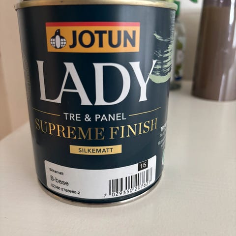 Selger en uåpnet 0,75 liters boks med Jotuns Tre & Panel Supreme Finish i fargen Frostrøyk. Glansgrad silkematt.