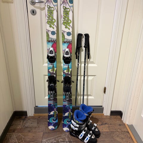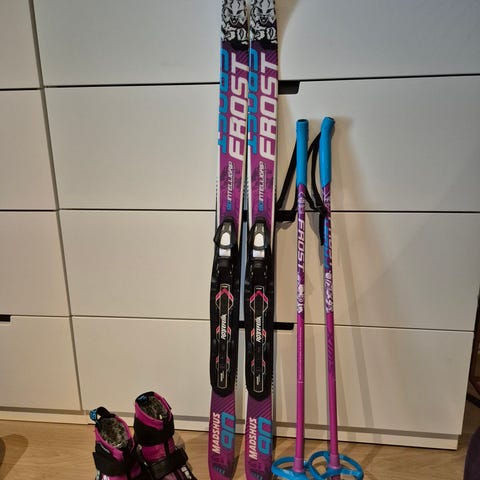 Perfekt sett til første par ski. Fischer smørefri barneski 90 cm med tilhørende skistøvler str 26 og staver.