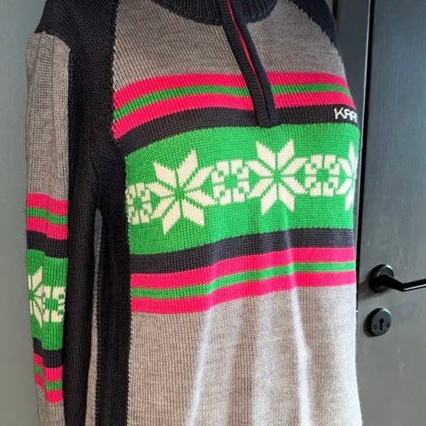 Ullgenser for dame i størrelse M. Genseren er flerfarget med mønster i ulike gråtoner, hvitt og mørke kontrastfarger. Rund hals og lange ermer. Strikket i ull, egnet som varm hverdagsgenser eller mellomlag på kalde dager.