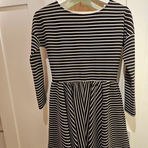 Cubus kjole for jente i størrelse 158-164. Kjolen er svart med hvite striper og har lange ermer, og stretchy stoff. Den er laget av organisk bomull, og har rund hals. Passer til hverdagsbruk og enkle anledninger. Ferdig prutet.