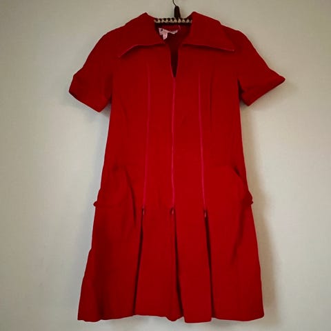 Vintage festkjole i grønn fløyel i størrelse xs for dame. Kjolen har kort erm, markert midje og lengde til under kneet. Den lukkes med glidelås bak. Sannsynligvis hjemmesydd, da merke mangler. 40-tal/50-tal