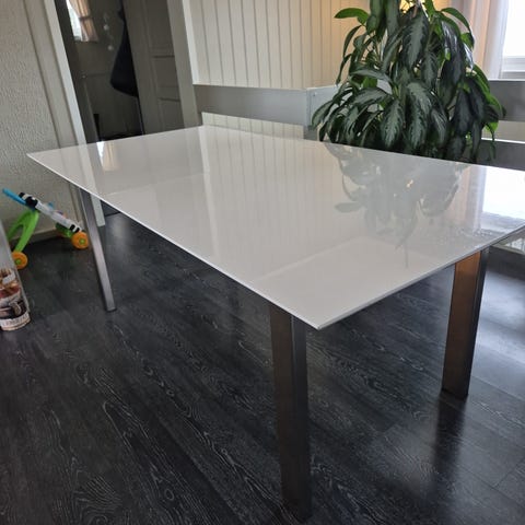 Spisebord med fire stoler gis bort. Det er også en ileggsplate med bredde 45 cm. Helt grei stand, ingen større skader. Kan hentes i Blystadlia tirsdag 17. februar