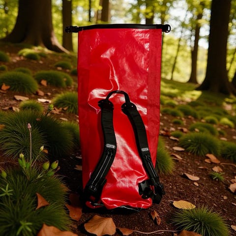 Ryggsekk med vanntettpose (stor pose fra Ortlieb) og sekketrekk.