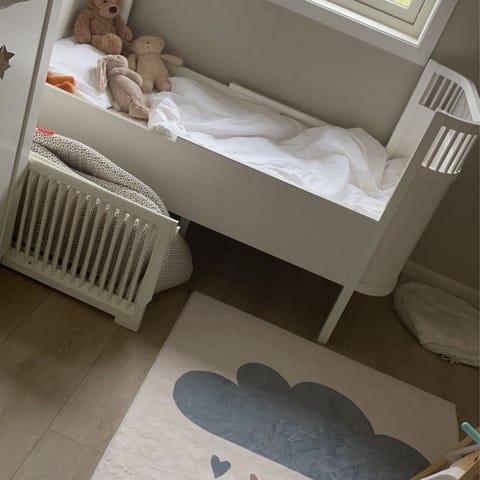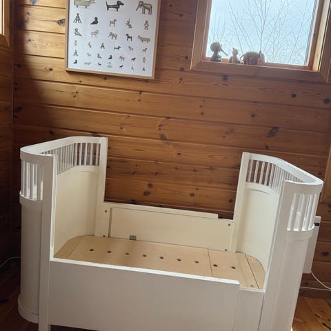 Klassisk hvit Kili sprinkelseng/juniorseng fra Sebra. Den eldre versjonen med pleksiglass (som kan fjernes om ønskelig). Den har en del bruksmerker som enten kan regnes som patina eller få et strøk maling. Du får med madrass og madrassforlenger om ønskelig. Har ikke heve- og senkebunn. Den er demontert.