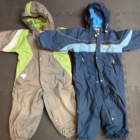 2 Reima Tec parkdresser i størrelse 110. Begge mangler en strikk (under skoene), men dette kan enkelt fikses. Den blå er uten hette, mens den sorte er med.