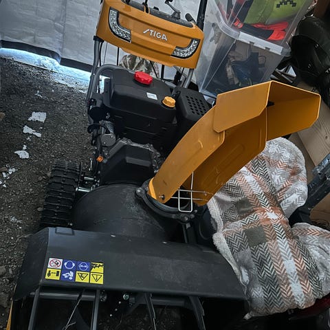 Stiga 11-74 HST snøfreser, Modellen er utstyrt med Briggs & Stratton Intek OHV-motor på 11 hk. Maskinen har hjuldrift med grove dekk for bedre fremkommelighet på snø og is. HST-betegnelsen indikerer hydrostatdrift. Trinnløs forrover og bakover