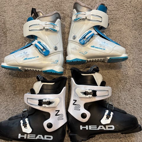 Nordica skistøvler 240-250 mm i farge blå og hvit. Egnet for bruk i alpint.