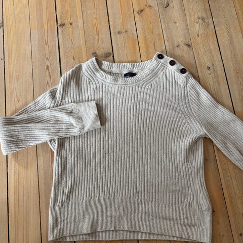 GANT genser for dame i størrelse S. Genseren er grønn og strikket i bomull med flettestruktur. Rund hals og lange ermer med ribbestrikkede kanter. Lite GANT-logoemblem på brystet. Passer til hverdagsbruk og kan kombineres med både bukser og skjørt.