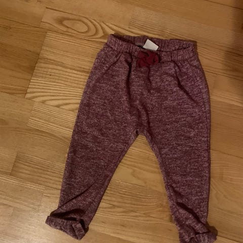 De grå buksene er av ull og har et lite hull som er sydd igjen med en lapp. De rosa buksene er av bomull og er litt skinnende.
