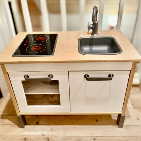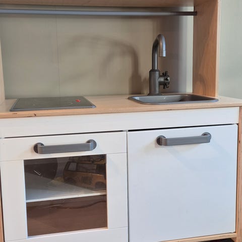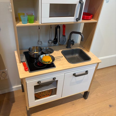 Kjøkkenet har komfyr med ovn og gjennomsiktig dør, kokeplater, vask med kran og flere åpne hyller til oppbevaring av lekemat og kjøkkenutstyr. Overdelen har ekstra hyller til tilbehør. Egnet som rollelek for barn som vil late som de lager mat og driver kjøkkenarbeid.