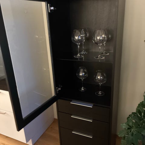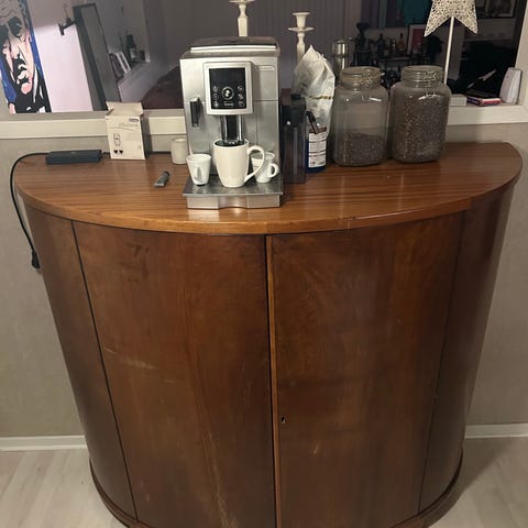 Skjenken mangler del som gjør at dørene "spretter opp" på to v de dører (se bilde). Dette kan kjøpes eksternt. Elles er dørene hele og intakte