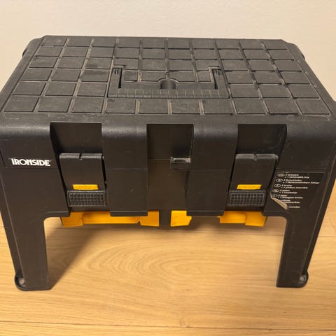 Verktøykasse og krakk i plast i fargene svart og rød. Kassen har lokk som kan åpnes, med et uttakbart innleggsbrett øverst for mindre deler og verktøy. Under innleggsbrettet er det et større rom for oppbevaring av større gjenstander. Oversiden er utformet slik at kassen også kan brukes som krakk eller arbeidsplattform. Egnet til oppbevaring og organisering av verktøy eller annet utstyr i garasje, bod eller verksted.