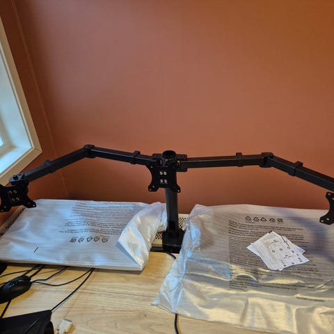 Dobbel skjermarm til skrivebord med VESA-feste. Armen har leddet konstruksjon som gjør det mulig å justere høyde og vinkel på skjermene. VESA-festet passer skjermer med firkantet hullmønster, 75 x 75 mm eller 100 x 100 mm. Skjermstørrelse fra 13" til 32". Max 9kg pr. arm. Monteres i bordkant med klemmefeste. Det følger med skruer og skiver for montering av skjerm på festet.