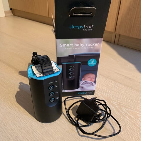 Sleepytroll vuggemotor til barnevogn i svart med turkise detaljer.