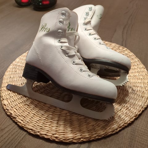 Pros barneskøyter i hvit og rosa farge. Modellen har justerbar plast- og tekstilstøvel med polstret innersko for bedre komfort.
