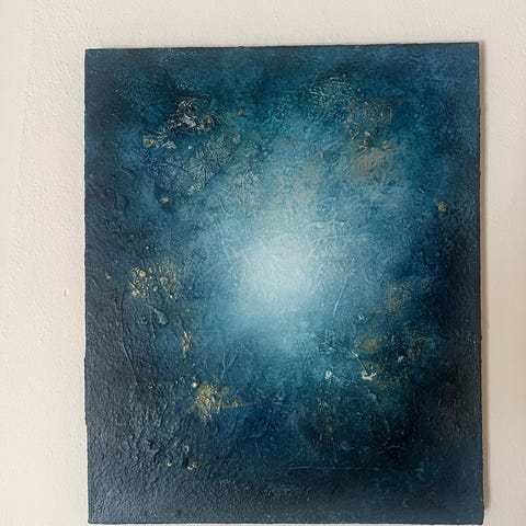 Maleri i dype blå , brune jordtoner med et mykt lysende sentrum som gir en følelse av ro, bevegelse og dybde.