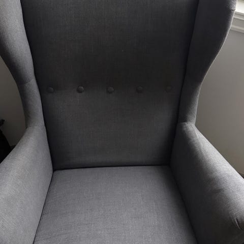Selger lenestol fra Ikea, Strandmon, i låsegrå. Puff følger med.