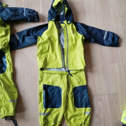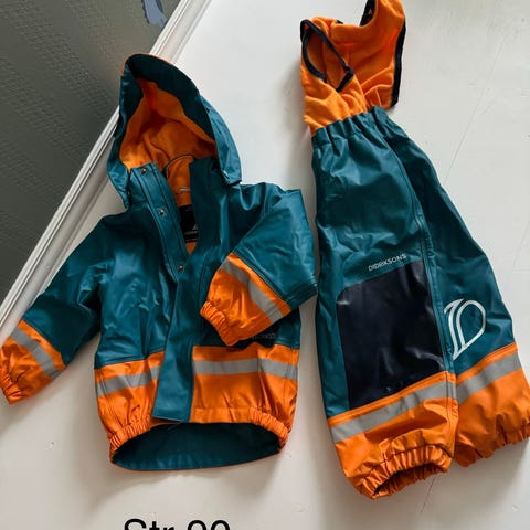 Regndress fra Didriksons i str. 90. Denne er brukt frem til han begynte med str. 98, så den passer lenge 😊 Pent brukt! Mangler fotstrikker