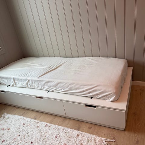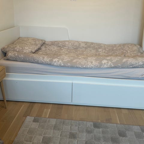 IKEA Brimnes seng med skuffeoppbevaring, ribbebunn, god madrass samt overmadrass.