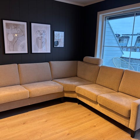 Står på hytte i Valdres i Nord-Aurdal frem til og med helga 22 februar. Kan ses der den helga. Etter det kan sofaen ses i Brumunddal.