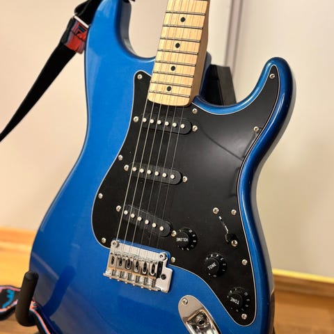 Blackstar FLY-forsterker (kjøpt ny) og instrumentkabel følger med. Forsterkeren gir 3W og fungerer fint på batteri (man kan også kjøpe strømledning). Kontroller for gain, volum, EQ og delay: nok til å utforske ulike lyder. Tar også bluetooth, så det går an å spille på favorittlåta. Kan også brukes som en vanlig bluetoothhøytaler til musikk.