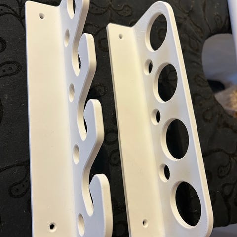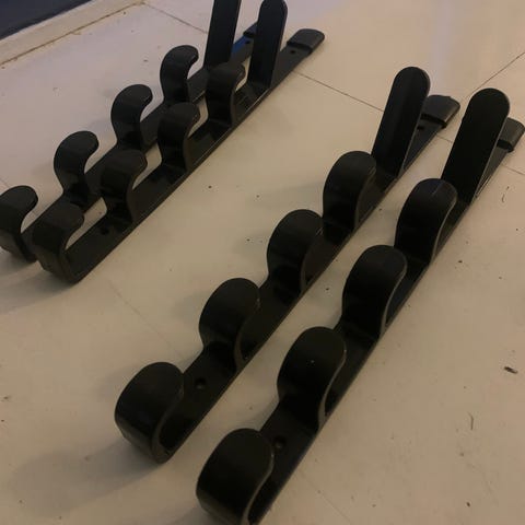 Stangholder for veggmontering i hvit plast. Produktet har tre separate holdere med åpne spor øverst for enkel plassering og fjerning av stenger eller lignende gjenstander. Egnet for organisering og oppbevaring der det er behov for å feste stenger eller rør på en veggflate. Monteringshull er integrert i platen for fast og stabil montering.