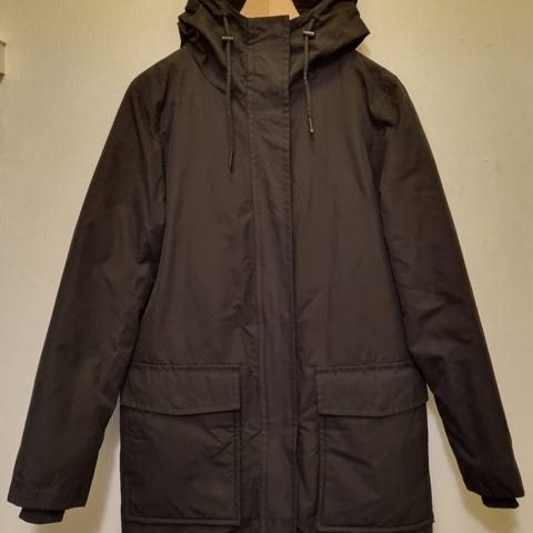 Samsøe Samsøe dun vinterjakke for dame i størrelse S. Jakken er svart og fylt med dun. Den har hette, glidelås og trykknapper i front. I livet er det snøring for justering av passform. Jakken har lommer foran.