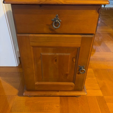 Beautiful side table/ nightstand. It has one drawer. I do not want to sell this because it is such a nice piece. It adds alot of character and texture to any room it is in. Unfortunately we do not have space for it in our new home.