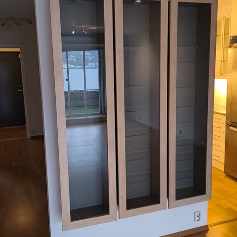 Praktisk skap med god plass til glass, vaser ol. Finer i lys eik i ramme, frostet glass i skyvedør. 5 hyller i tre, 5 hyller i glass. Stor bruksverdi, men noe slark i festene. Anbefaler demontering før skapet flyttes på nytt. Gis bort mot henting.