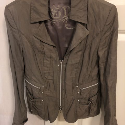 Gerry Weber jakke for dame i størrelse S. Jakken er flerfarget med vevd mønster og er laget i bomullsmateriale. Den har lange ermer, rund hals og glidelåslukking foran. Diskré kontrastdetaljer og lommer foran gir et strukturert uttrykk. Passer til bruk over topp, bluse eller kjole i hverdagen eller til mer pyntede anledninger.