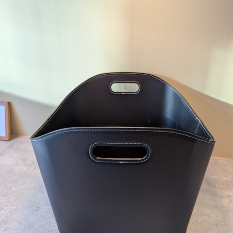 Fin og romslig flettet kurv til oppbevaring av ved, pledd, aviser/blader etc.