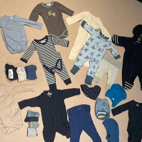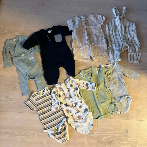 Babyklær sett for gutt i størrelse 56. Pakken inneholder flere bodyer med korte og lange ermer i ulike farger og mønstre, samt lette jakker/genser med og uten hette. Fargene er hovedsakelig lyseblå, beige, svart, hvit og stripete, altså flerfarget.