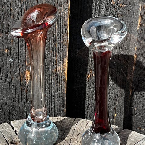 To fine hundebeinsvaser / Trompetvaser med boblefot fra Åseda Glasbruk. 1rød og en mørk lilla. Designer Bo Bergström, ca 1960-tallet.
